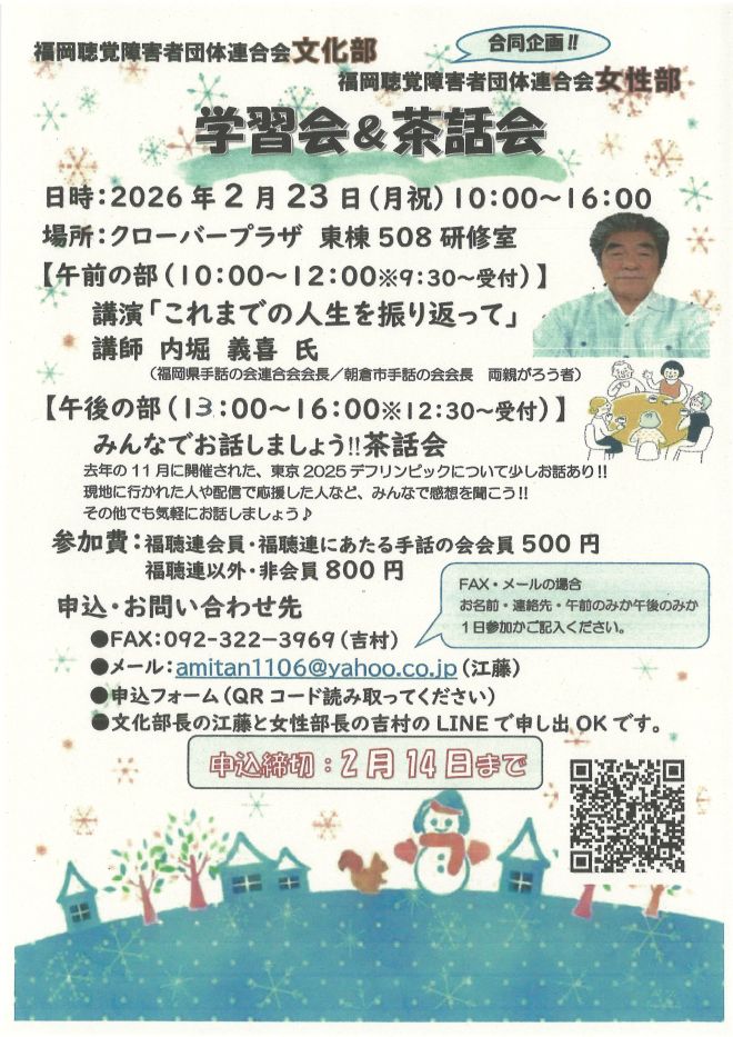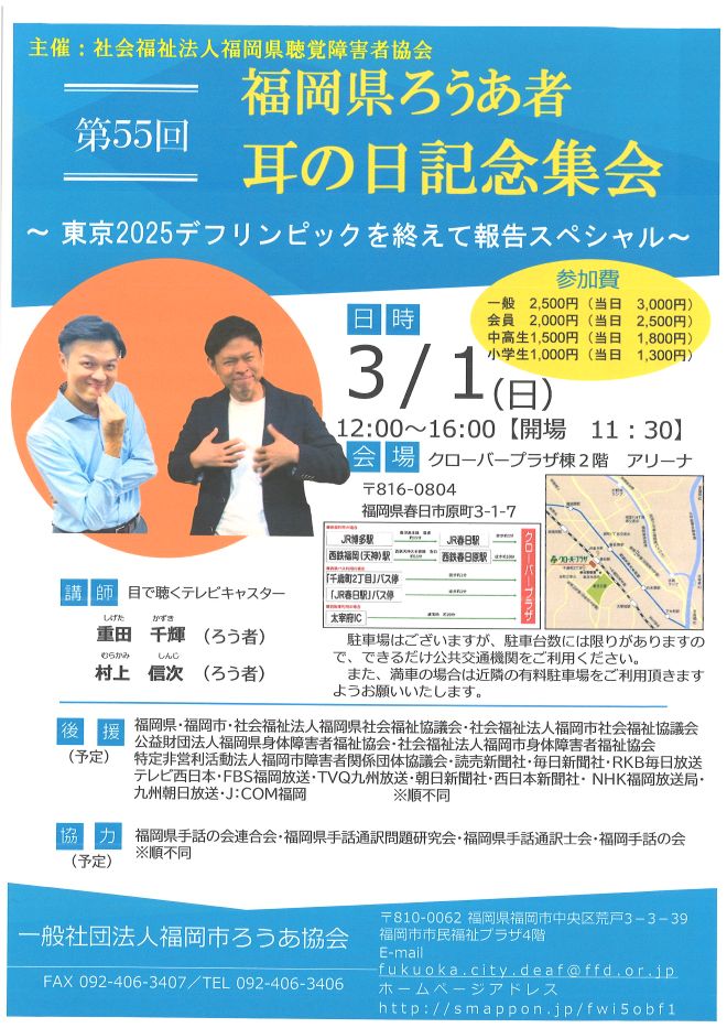 日にち①2025年12月25日(木)②2025年12月26日(金)時間①、②とも13:30~15:30場所:クローバープラザ(春日市) チラシ(PDF) Web申込 問合せ先(社福)福岡県聴覚障害者協会fax092-58 … もっと読む>>