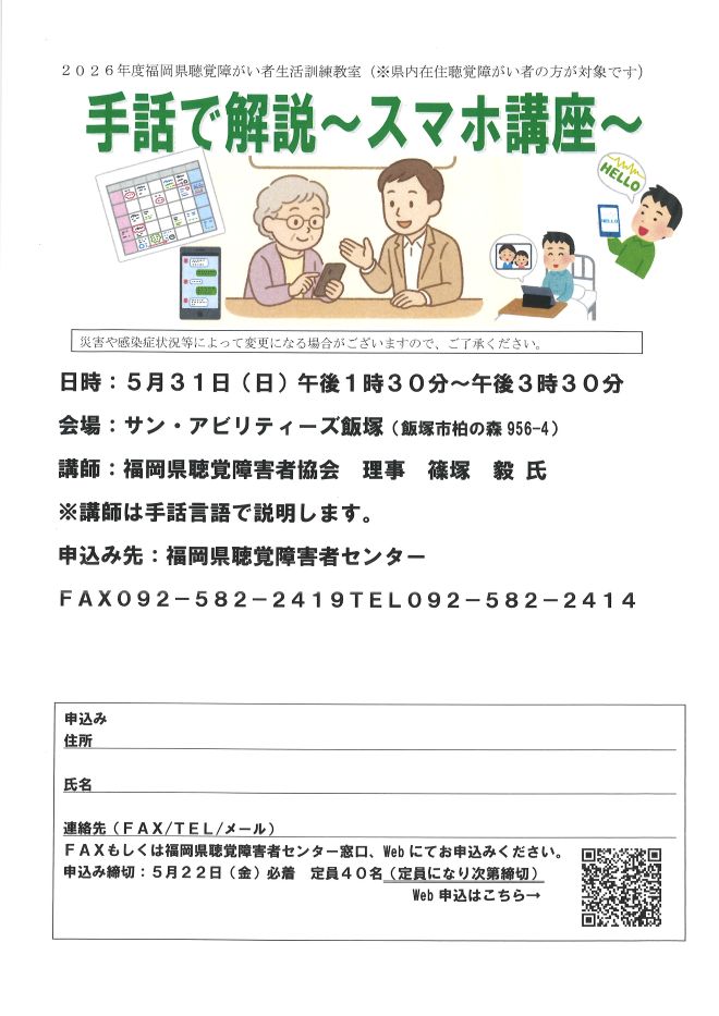問合せ先福岡県聴覚障害者センターfax092-582-2419 tel092-582-2414